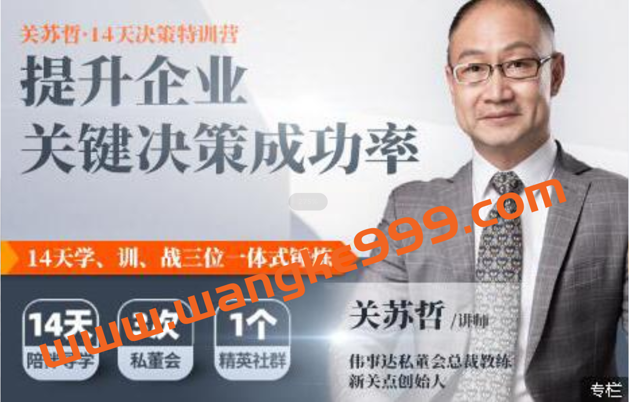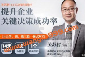 课程来自更新学堂关苏哲的14天决策特训营培训课程视频,价值799元。本课程有效破解工作难题,帮助学员建立长远目标与短期行动逻辑关联,提升关键决策科学性与有效性,克服会而不议,议而不决,决而不行的陋习,掌握体系化、流程化的决策制定方法,帮助学员重塑个人与团队心智,走出低效沟通误区,通过学习体验私密、坦诚、高效的私董会小组,围绕成员个性化的难点问题,群策群力制定针对性解决方案。